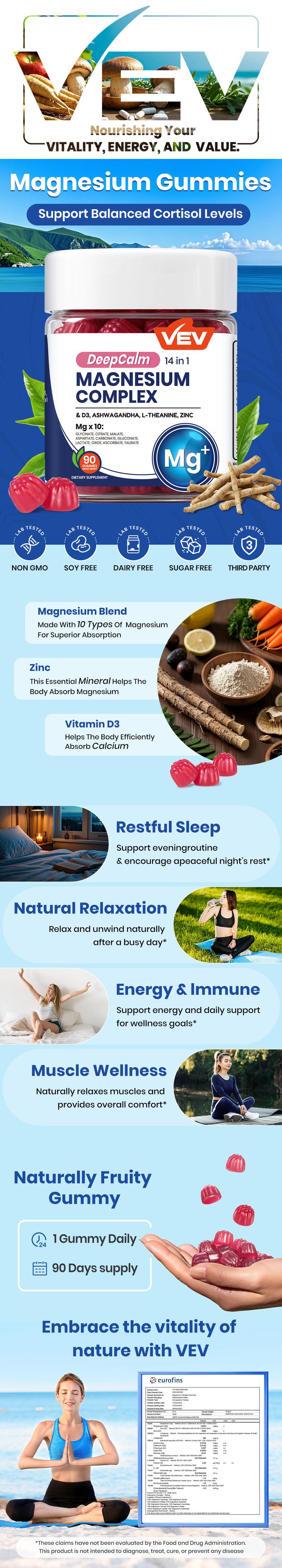 Discover the VEV 14-in-1 Magnesium Supplement – a unique blend of 90 gummies. Each gummy is packed with essential nutrients like Ashwagandha, L-Theanine, Vitamin D3, and Zinc. Perfect for those seeking a convenient way to support their health.